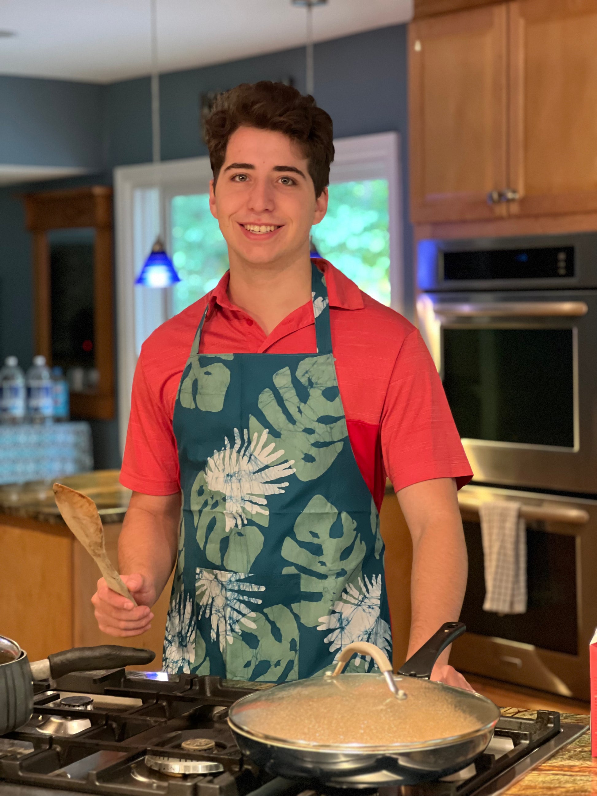 ON SALE Single-sided aprons with purple, teal & greenish leaves or banana designs   WAS $24 NOW $18
