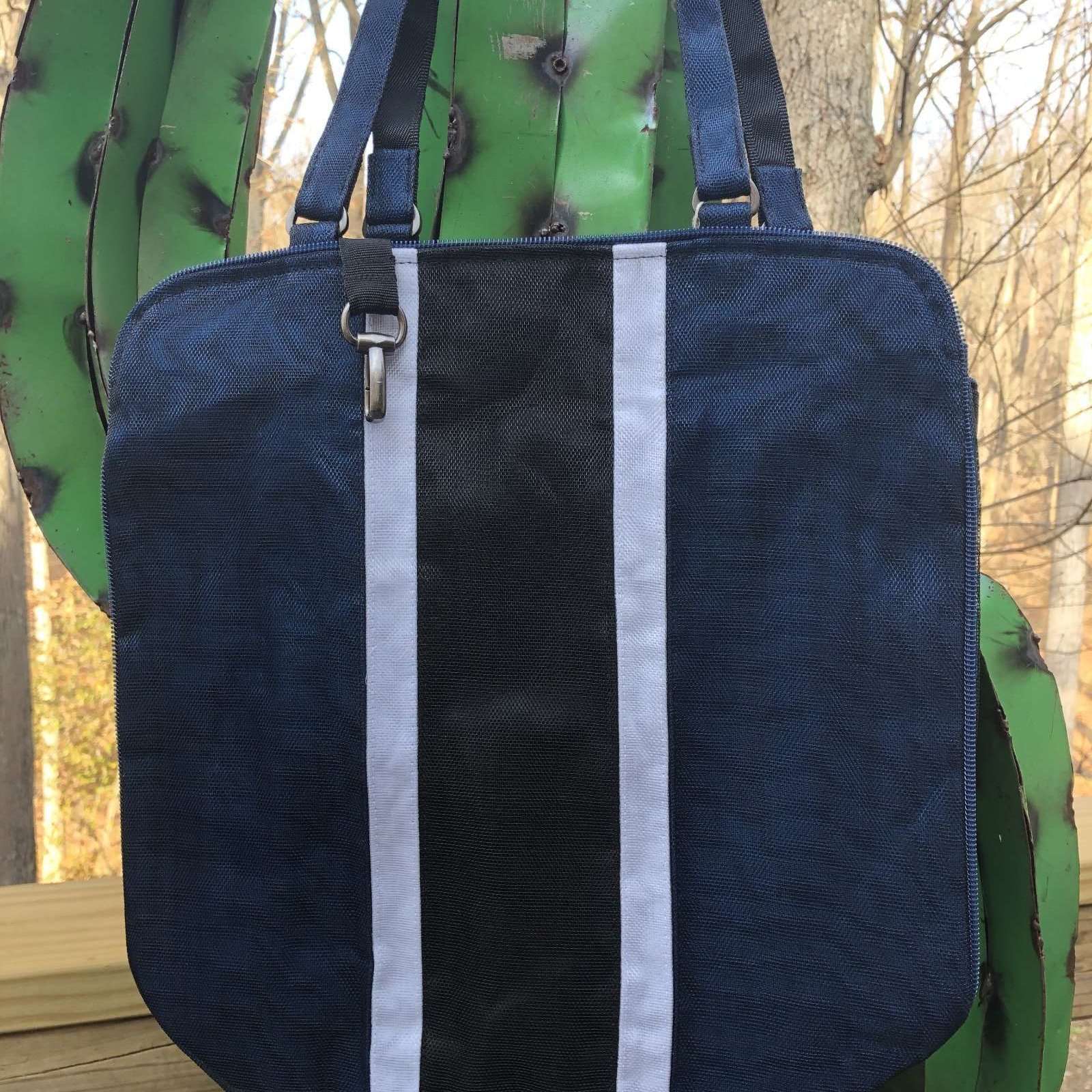 Chic Two-Tone All-Purpose Tote Bag to Schlep Wherever Your Office Is. Impressive at meetings, efficient at carrying it all. Lightweight with interior pockets and an attached hook to conveniently find your key fob or wallet. Available in navy or gray with black and white stripes while supplies last! WAS $100 NOW $68