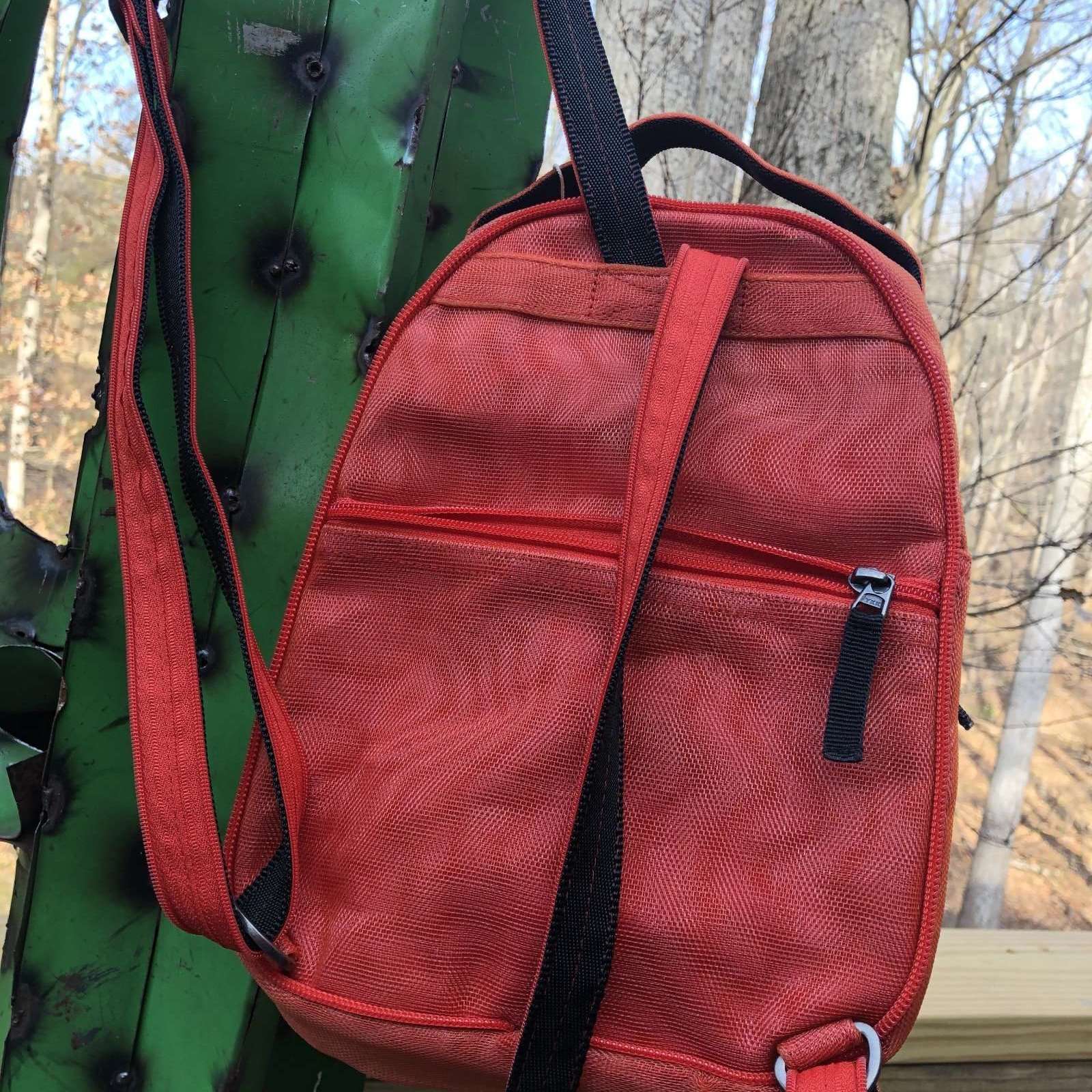 A cool around town contemporary mini backpack for the light stylish traveler. Made from fish and commercial netting, this backpack features zipper compartments on each outside, an adorable handle, a waterproof durable inside with a convenient pocket and adjustable straps, great for wearing with one or two shoulders. Available in Persimmon, and Navy while supplies last! Dimensions 11"H x 8"W x 3"D WAS$89 NOW$68