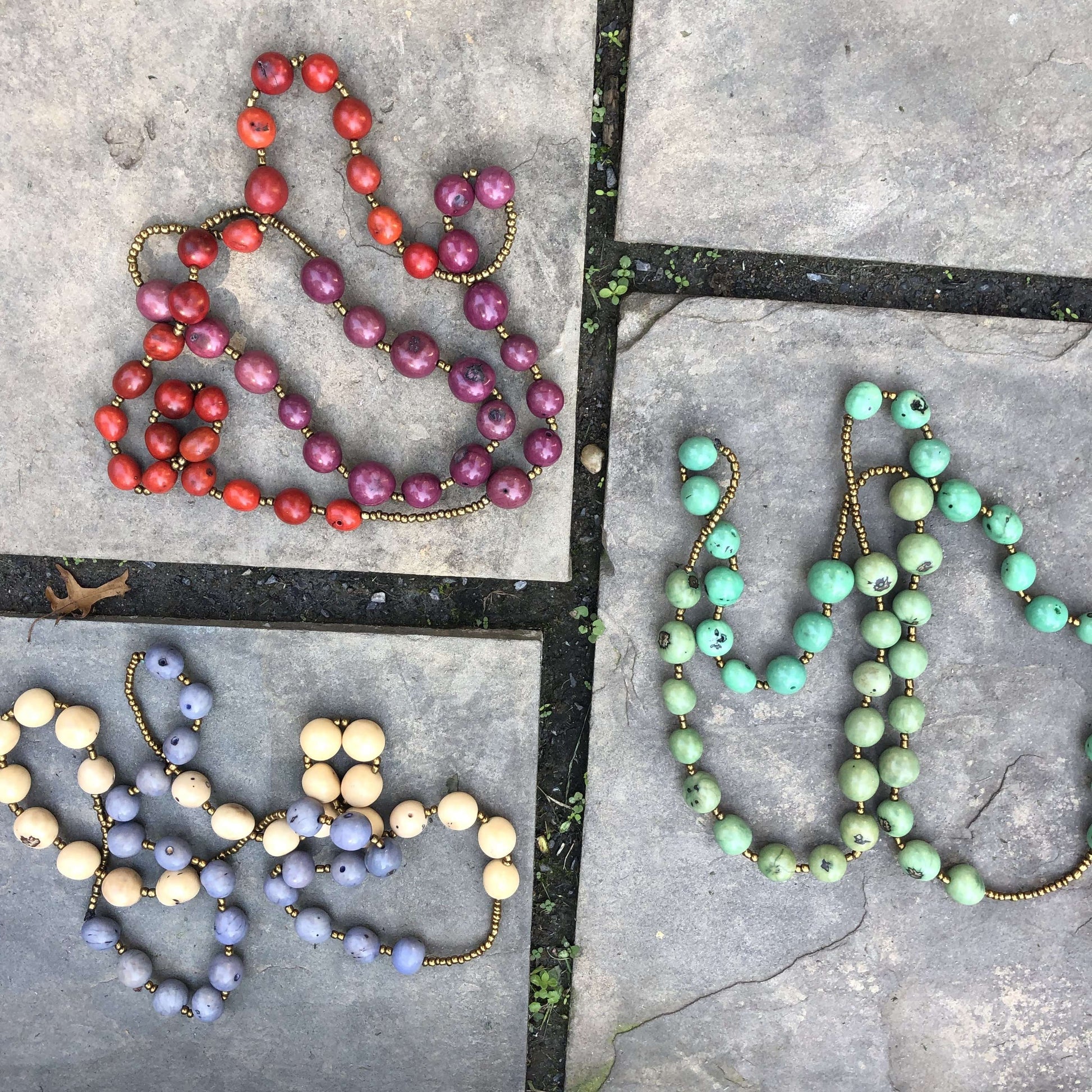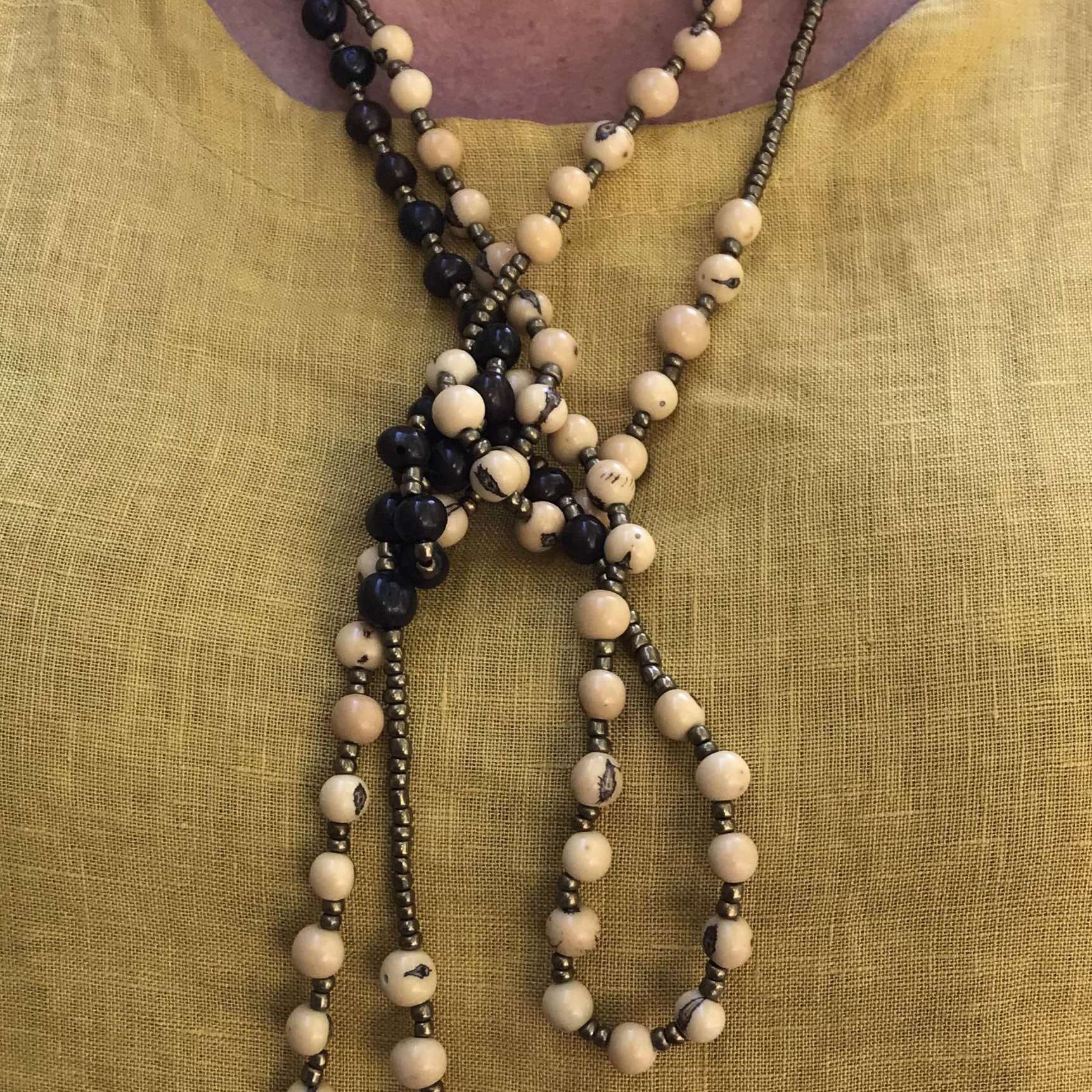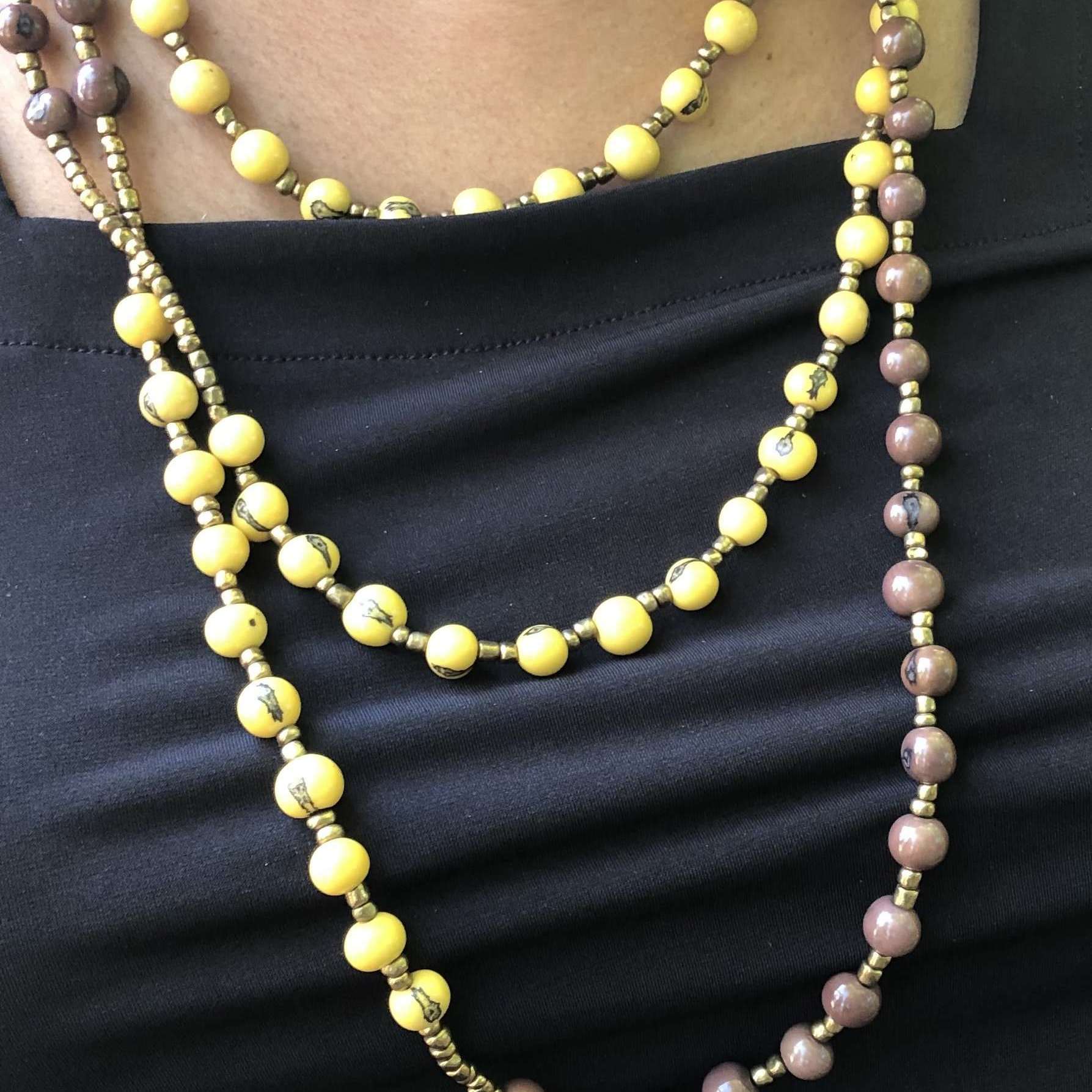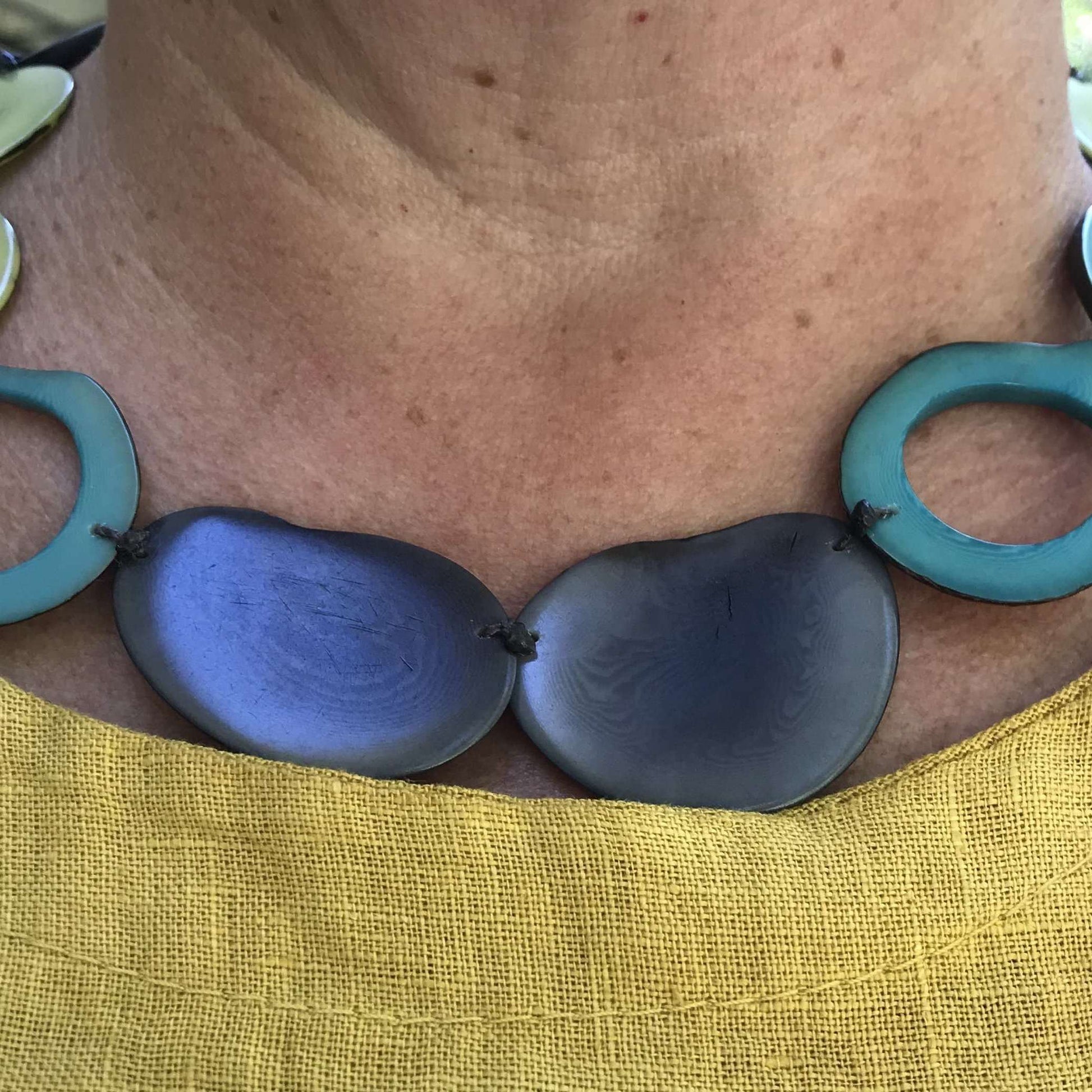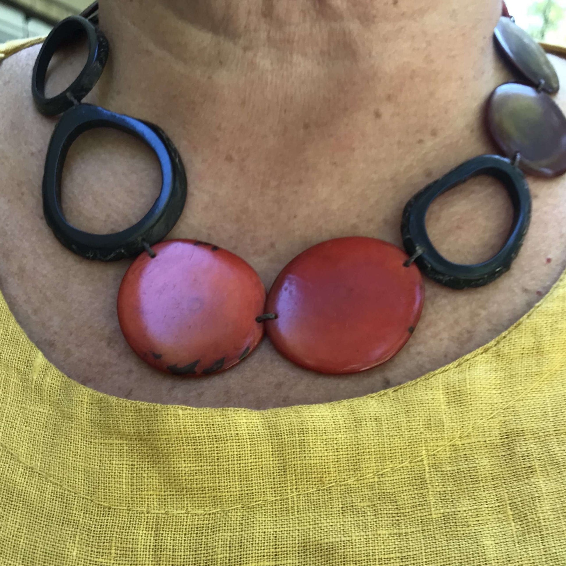 The Ventana Flirty Necklace (18"), Sunset and Lime, makes a striking statement with the colorful tagua beads. 18"