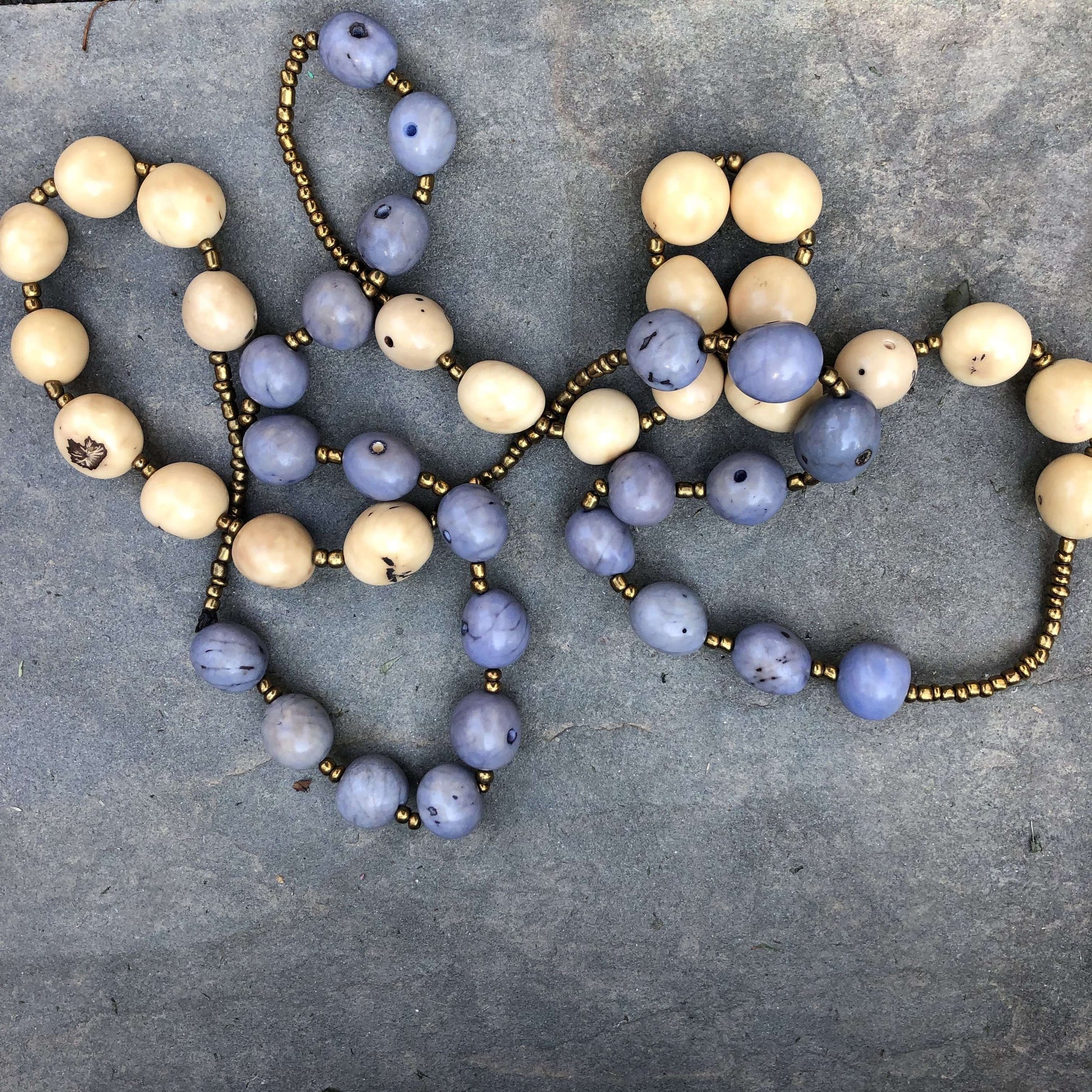 For those who can't remember the correct pronunciation, acai is pronounced ah-sah-EE, and variations are personally designed by Mother Nature. Fair Trade artisans shape, size, & color the beads. The tagua nuts, pronounced TAG-WAH, are from palmule trees, and are nicknamed vegetable ivory because of their versatility and strength. The combination of the acai seed and tagua nut makes for a striking balance.