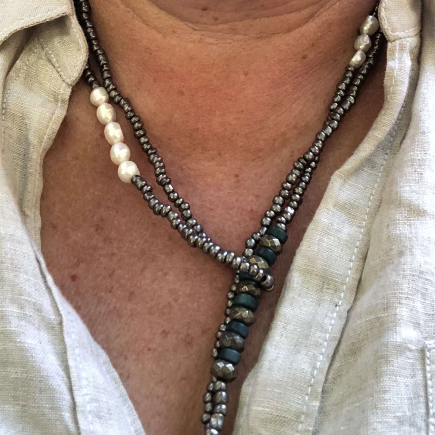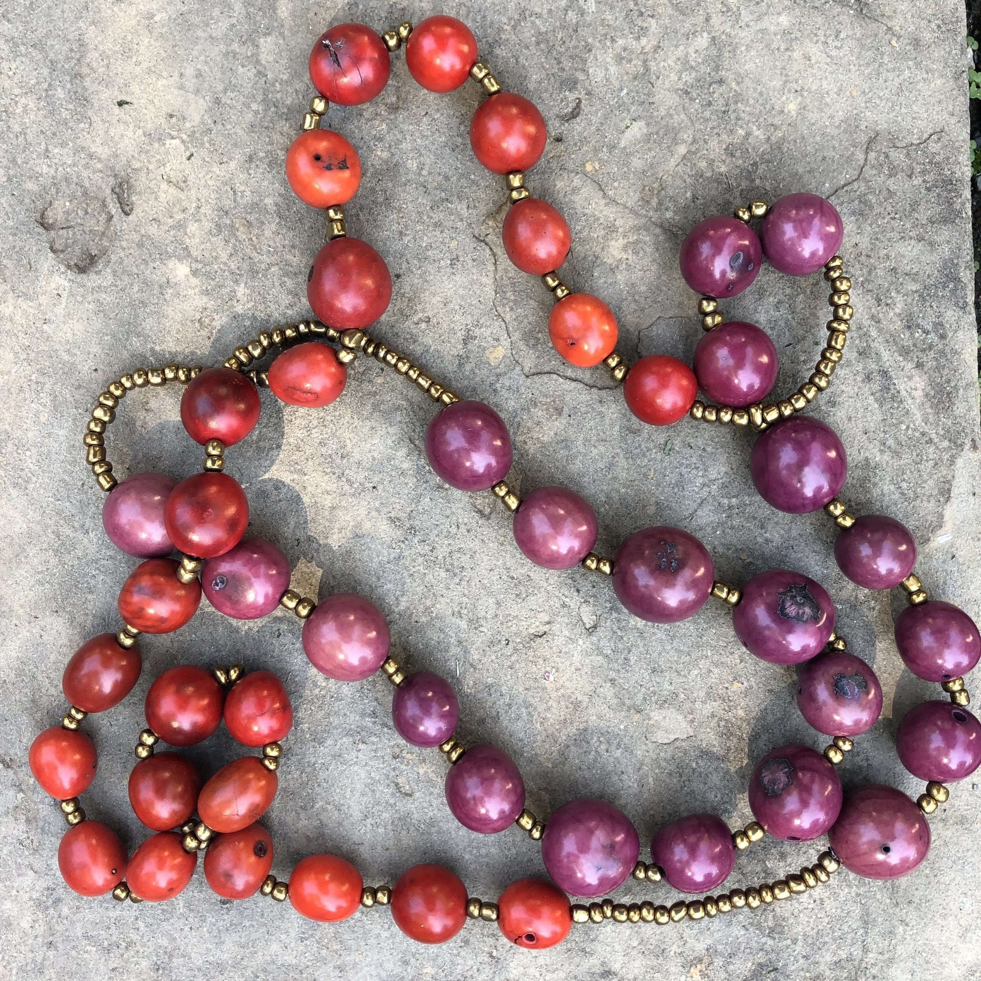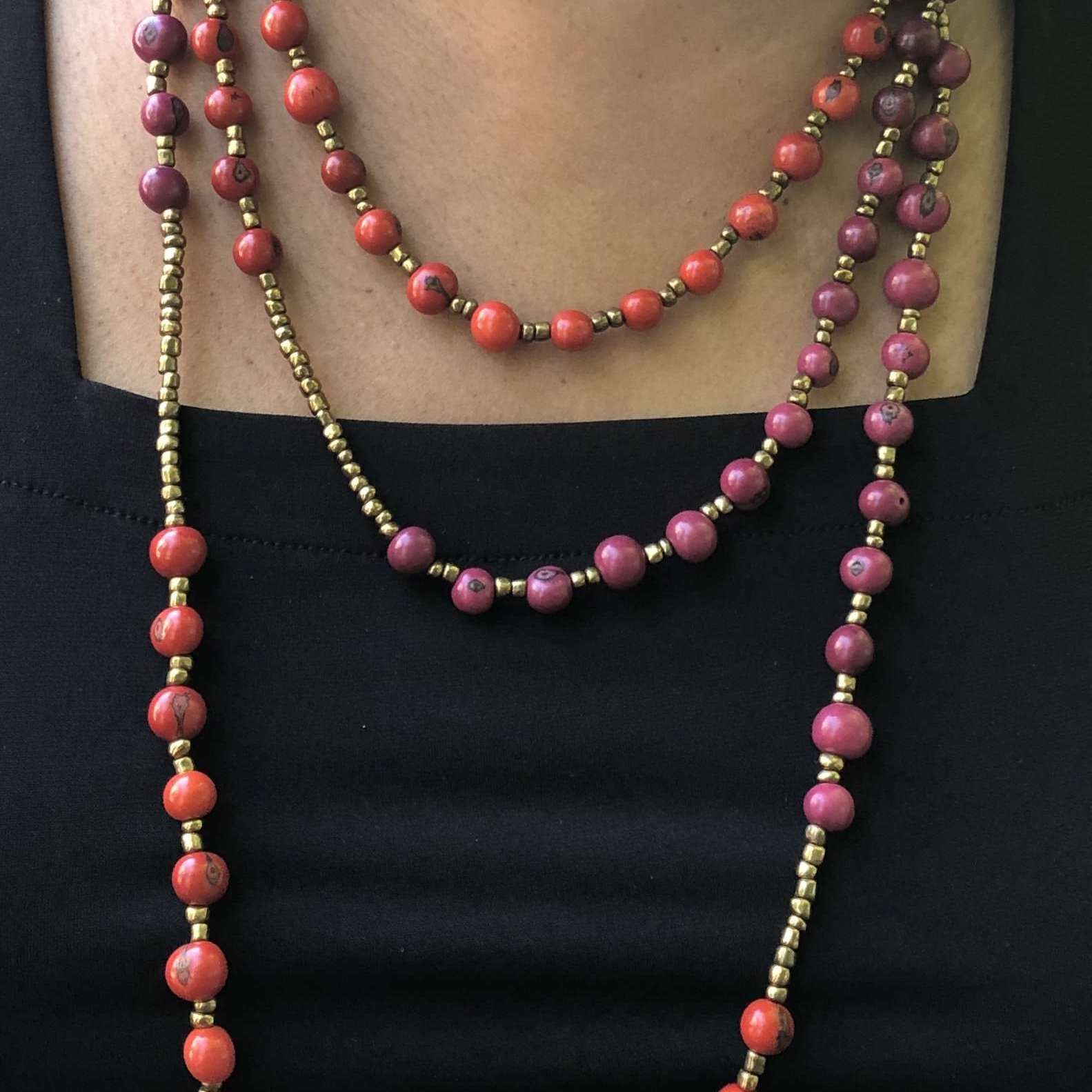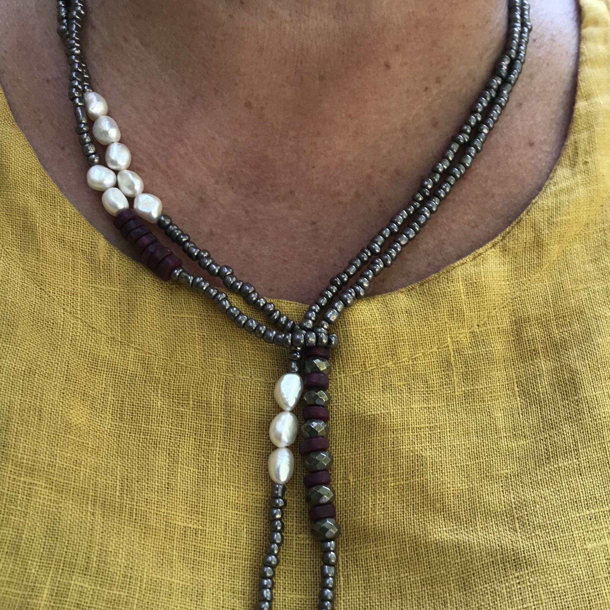 The Flirty Pearl Necklace (48"), Burgundy and Teal, made from metallic beads, freshwater pearls, glass beads, and tagua is really the wonderful balance to any outfit.