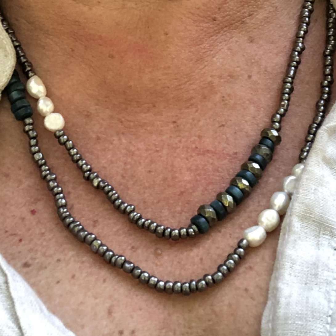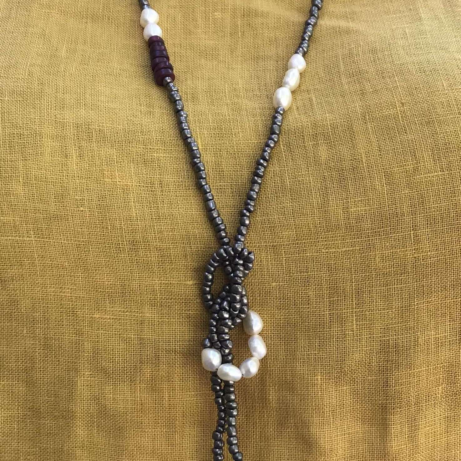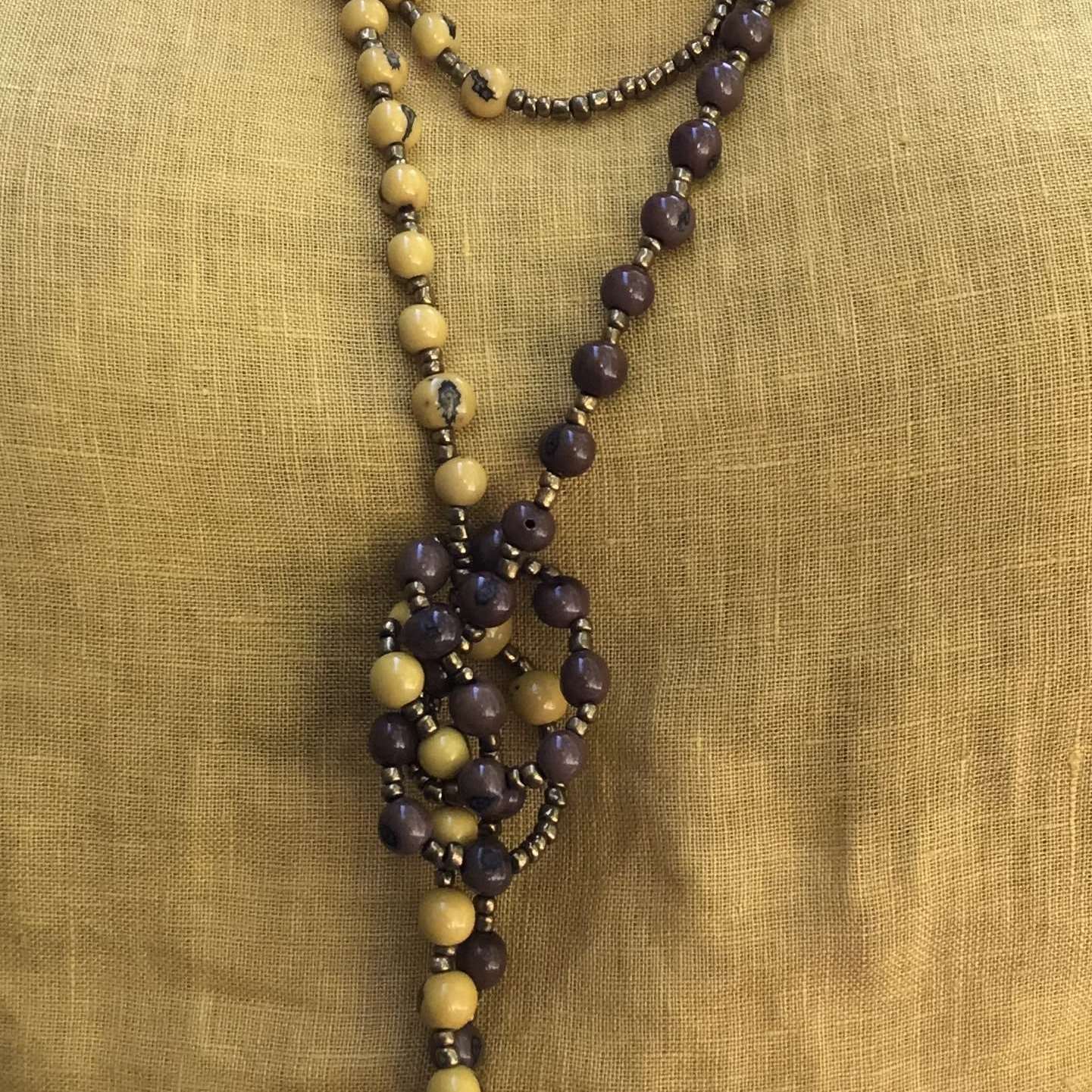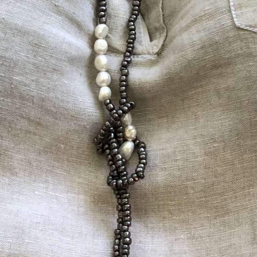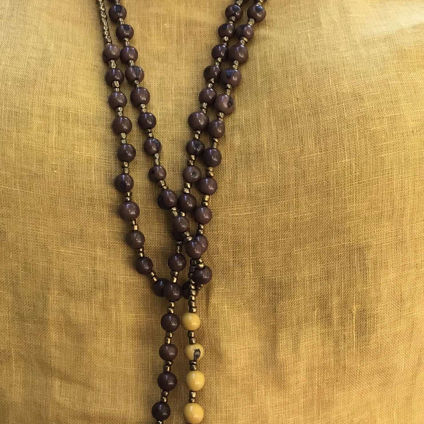 The Flirty Pearl Necklace (48"), Burgundy and Teal, made from metallic beads, freshwater pearls, glass beads, and tagua is really the wonderful balance to any outfit.