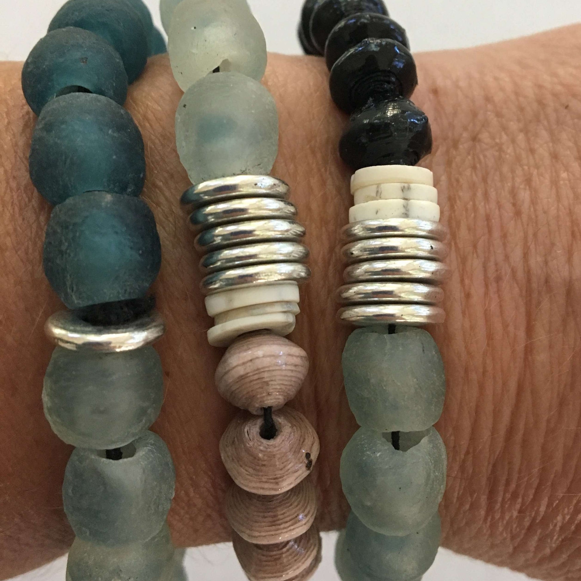 Cool Water is made from recycled glass only. The non-glass beads on the Midnight and Blush bracelets are made from recycled paper.